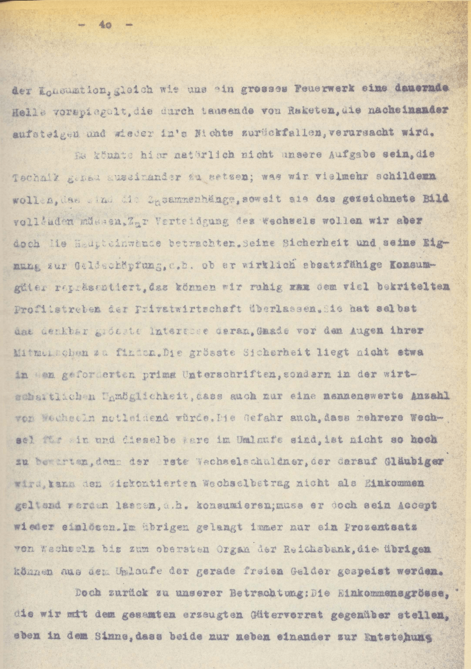 [S. 38] darstellen;– wenn es heute nun den Kauf vermittelt durch Hingabe von Nominaleinkommen gegen Güter, so ist das durch den Schleier gesehen der gleiche witschaftliche Vorgang. Diese letzte Karte decken wir auf, wenn wir den Mechanismus kurz erklären, wie das Nominaleinkommen, das Geldeinkommen entsteht. Nach unserer ganzen Ausführung kann es keine Frage sein, dass wir es in engster Anlehnung an die Güterproduktion zur Schöpfung bringen müssen. Stellen wir dabei die Geldkreation auf Grund des akzeptierten Warenwechsels als die der Vollendung am nächsten kommende Einrichtung hin, so handeln wir nur folgerichtig unserer bisher beschriebenen Auffassung.