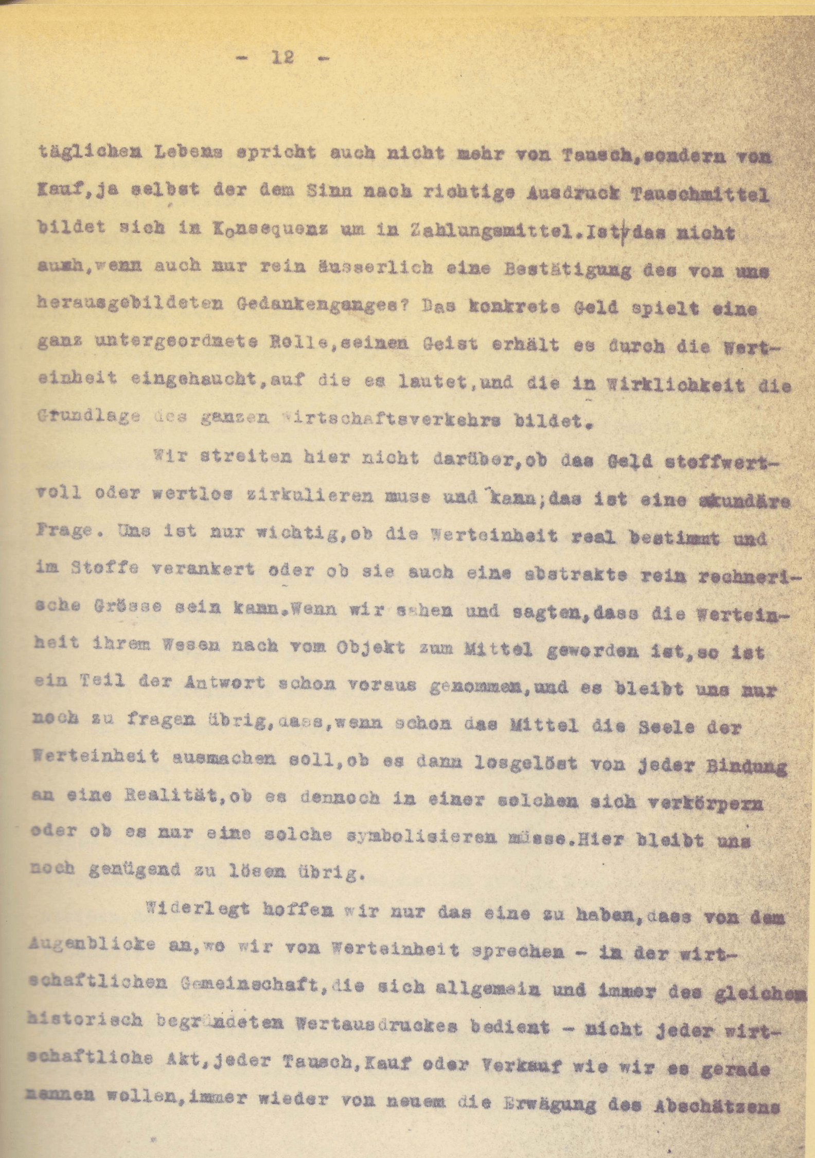 Das Vorhandensein des realen Tauschgutes kann uns somit nicht hinden, so sehr es auch das Bild verschleiern kann, den wahren Charakter des Geldes im Tauschmittel zu erblicken, ja sogar dann erst den Begriff Geld überhaupt anzuwenden, wenn die Werteinheit, auf die es lautet, ihrem Inhalt und Wesen nach vom Objekt zum Mittel sich gewandelt hat. Wenn die Werteinheit, das Gut Gold, gleich wie es in jener definiert ist, allein den Gegenpol zu allen anderen Gütern bildet, so ist es naturnotwendig, dass es, ausgenommen den Fall wirklich einmal zur letzten Befriedigung zu dienen, die historische Verankerung und damit auch seine Selbstständigkeit im menschlichen Denken verliert und uns als Grösse nurmehr in der Vielfalt der Relationen und Preise etwas zu sagen hat. Die Gewohnheit des