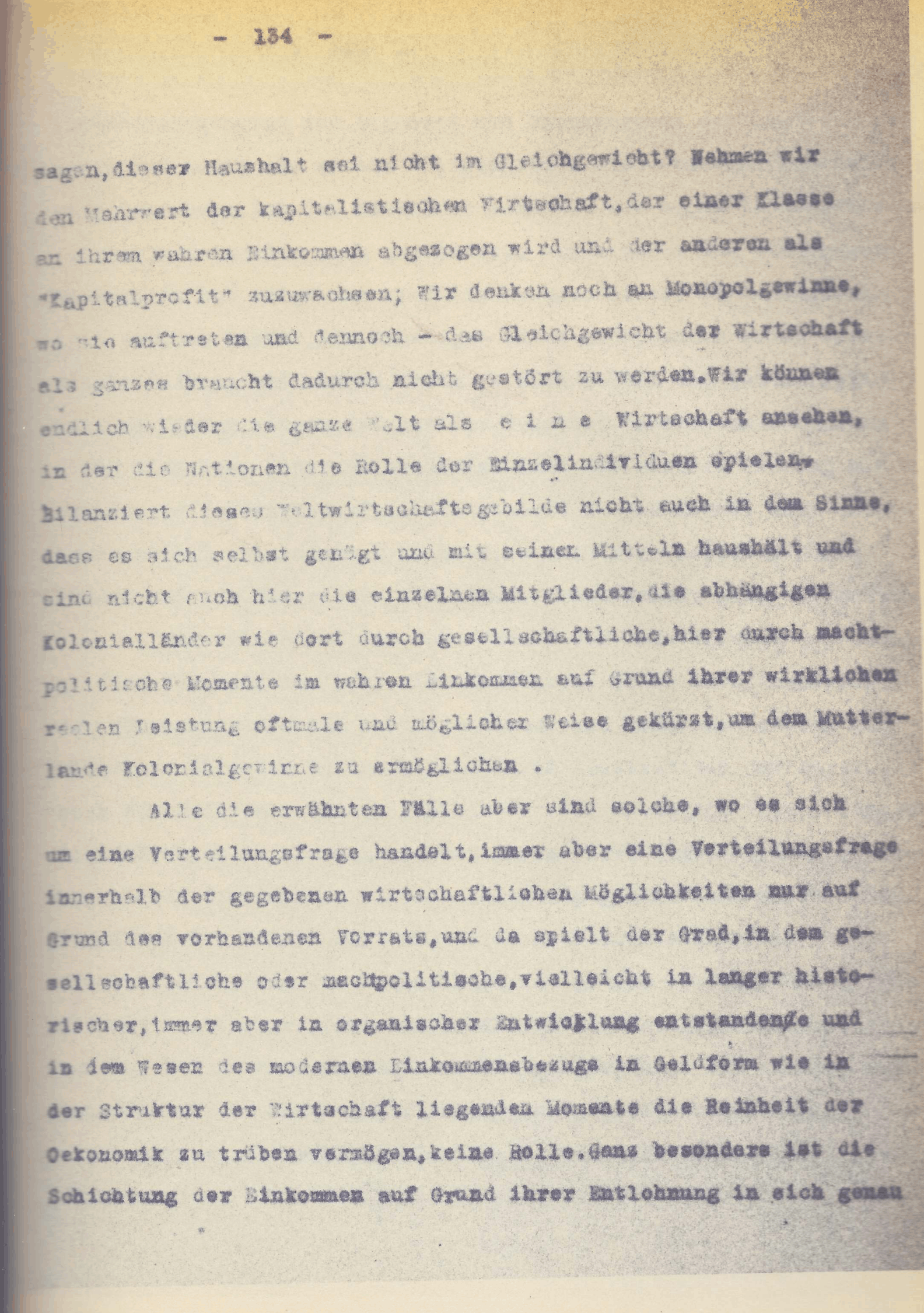 [S. 158] Wenn wir nicht die Arbeits m e n g e als Einheit der Güter, der Einkommen und damit auch des Geldes in Anwendung brachten, sondern diese Menge noch verknüpften mit dem W e r t e der Arbeit, so bedeutet das nur einen Korrekturposten, den einzusetzen uns die kapitalistische Wirtschaft zwingt, beruhend auf der Verschiebung der Einkommensarten untereinander. Die Güter selbst werden sich in ihrem wirklichen Arbeitswerte nicht zu sehr und nur selten entfernen können, die Nominaleinkommen dagegen, die in der reinen Oekonomie auch im einzelnen die genauen Gegengrössen zum einzelnen Arbeitsaufwand darstellen, sind in der kapitalistischen Wirtschaft auf Grund eines gesellschaftlichen Monopols zu Gunsten der Kapitalbesitzer verkürzt. Darum erkannten wir auch in der Definition auf Arbeits w e r t menge und verstehen dabei unter Wert eigentlich nur die falsche Wertung einer gewissen Wirtschaftsordnung. Es bedeutet einen Schönheitsfehler dieser Aera, der mit Ueberwindung derselben wenigstens in diese Form in Wegfall geraten würde. Alles Streben drängt zur reinen Oekonomie.