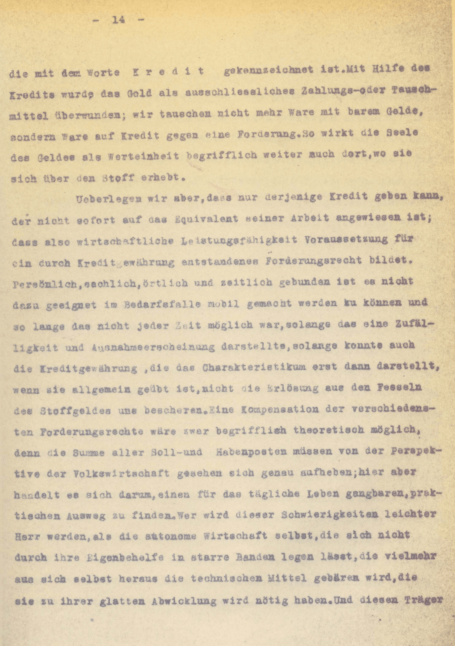 [S. 14] die mit dem Worte K r e d i t gekennzeichnet ist. Mit Hilfe des Kredits wurde Gold als ausschliessliches Zahlungs- oder Tauschmittel überwunden; wir tauschen nicht mehr Ware mit barem Gelde, sondern Ware auf Kredit gegen eine Forderung. So wirkt die Seele des Geldes als Werteinheit begrifflich weiter auch dort, wo sie sich über den Stoff erhebt.