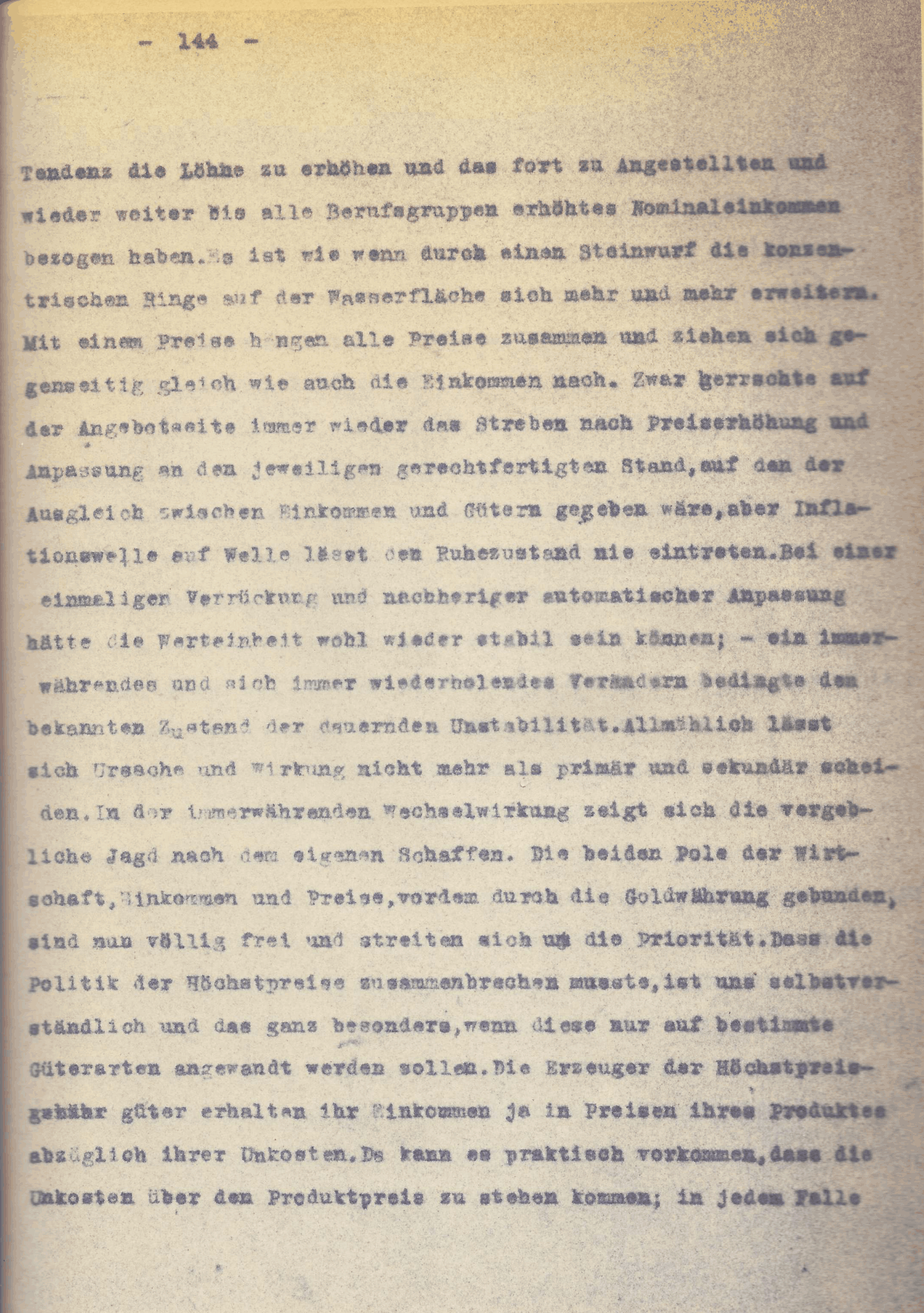 [S. 151] Dass wir in der modernen Wirtschaft die Opfer, die wir notwendig bringen mussten, nicht gleich als solche für den einzelnen verspürten und nicht verspüren wollten, dass uns die Scheinmöglichkeit belassen wurde, sie auf andere abzuwälzen, ohne dass die Volkswirtschaft als ganzes Schaden nehme, dass liess den Kampf und die Verschiebung der Einkommen Folge werden. Wir erkennen also, nicht die Preissteigerung, auch nicht der Stand der Valuta ist das Entscheidende und Schädigende der Inflation und beides ist kein Gradmesser, sowohl nicht unseres Wohlergehens, als unseres Elends. Beides könnte die Wirtschaft wohl ertragen ohne nennenswerte Störung. Das tief greifende und schwer zu heilende Uebel der Inflation, das ist die Verschiebung der Einkommen, entstanden durch die verschiedenartige Bewertung der Leistung als der realen Güter und notwendig bedingt durch ständig neu geschaffene Einkommenswellen, die jegliches Ausgleichsbestreben von neuem überfluteten und jegliches Vergleichsmaass uns raubten. Das Vergleichsmaass Arbeit war im Nominaleinkommen nicht mehr heraus zu lesen, weil es die Beziehung zu den Preisen und den durch Arbeitsaufwand erzeugten Gütern verloren hatte.