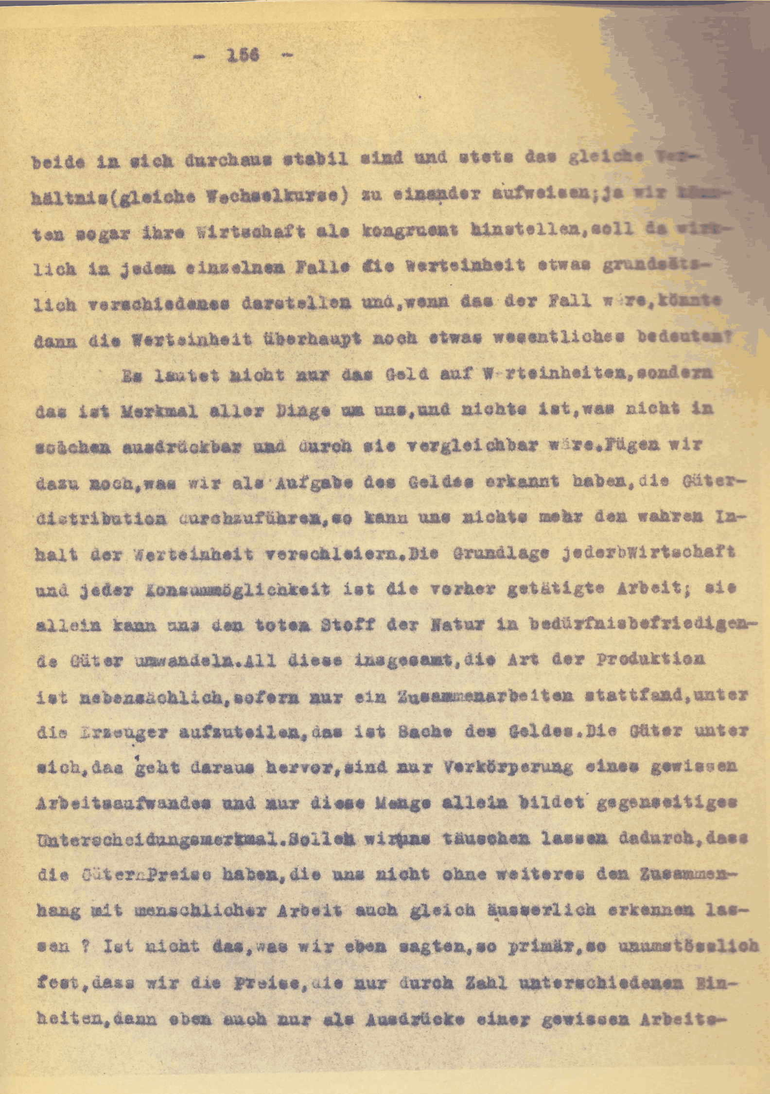 [S. 156] beide in sich durchaus stabil sind und stets das gleiche Verhältnis ( gleiche Wechselkurse ) zu einander aufweisen; ja wir könnten sogar ihre Wirtschaft als kongruent hinstellen, soll da wirklich in jedem einzelnen Falle die Werteinheit etwas grundsätzlich verschiedenes darstellen und, wenn das der Fall wäre, könnte dann die Werteinheit überhaupt noch etwas wesentliches bedeuten?