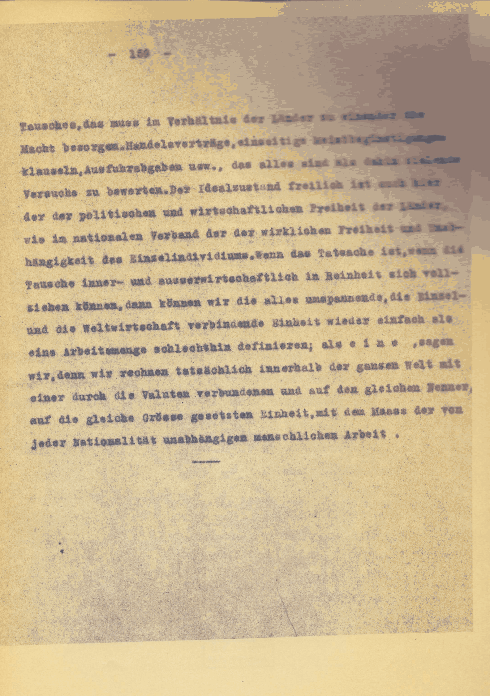 [S. 159] Tausches, dass muss im Verhältnis der Länder zu einander ihre Macht besorgen. Handelsverträge, einseitige? Meistbegünstigungs-? klauseln, Ausfuhrabgaben usw., das alles sind als ?dahin zielende? Versuche zu bewerten. Der Idealzustand freilich ist auch hier der der politischen und wirtschaftlichen Freiheit der Länder wie im nationalen Verband der der wirklichen Freiheit und Unabhängigkeit des Einzelindividuums. Wenn das Tatsache ist, wenn die Tausche inner- und ausserwirtschaftlich in Reinheit sich vollziehen können, dann können wir die alles umspannende, die Einzelund die Weltwirtschaft verbindende Einheit einfach als eine Arbeitsmenge schlechthin definieren; als e i n e, sagen wir, denn wir rechnen tatsächlich innerhalb der ganzen Welt mit einer durch die Valuten verbundenen und auf den gleichen Nenner, auf die gleiche Grösse gesetzten Einheit, mit dem Maass der von jeder Nationalität unabhängigen menschlichen Arbeit.