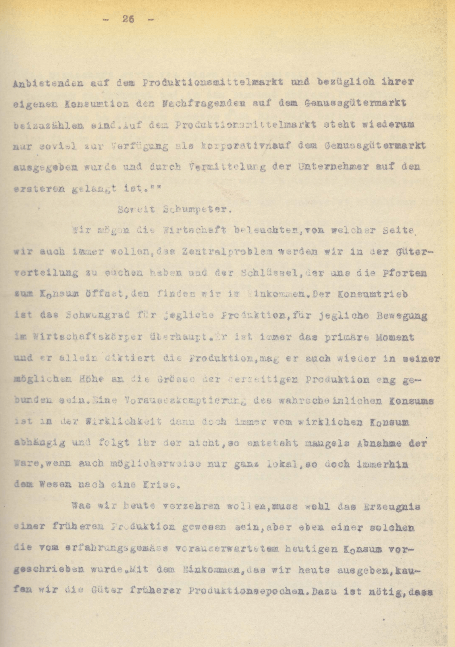 Sei es Grund und Boden oder Vieh, sei es menschliche Tätigkeit vom Dienst des Baerensammlers bis zur höchstqualifiziertesten geistigen oder organisatorischen Arbeit, ob es nun Erz und Kohle oder gleich der stolze Oceanriese, ein Kindersteinbaukasten oder ein Wolkenkratzer in der New Yorker City, der millionste Kliescheeabzug eines Bilderbuches oder ob es das Kunstwerk eines unserer besten Meister sei ;– Dinge, die wir nie und nimmer vergleichen könnten, in der Form, dass wir sie auf einen gemeinsamen Ausdruck bringen, sie scheinen im Spiegel der modernen Wirtschaft gleichgemacht. Der Begriff der Werteinheit scheint uns etwas real wirtschaftliches darzustellen und es bleiben übrig und regieren nurmehr die Zahlen, die sich gegeneinander wägen, damit den Mechanismus der Wirtschaft in Gang setzend.