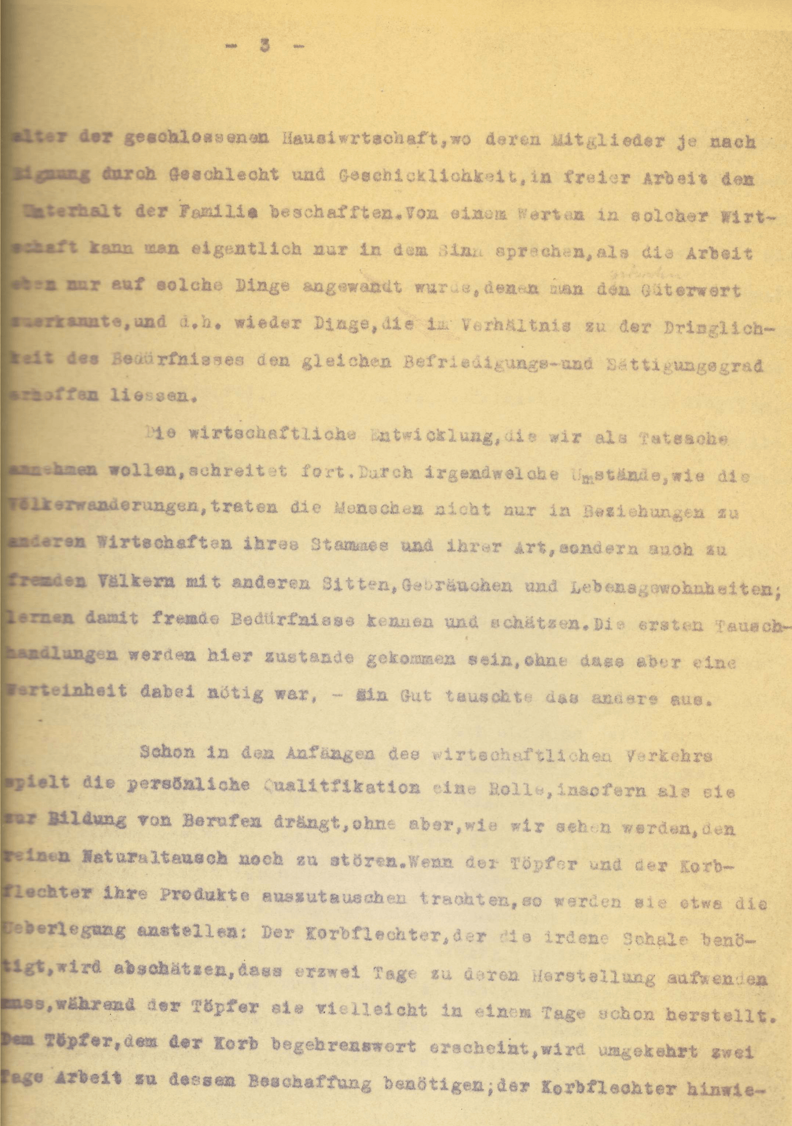 [S. 4]derum hierzu nur einen Tag. In der Hingabe ihres Erzeugnisses tauschen die beiden die Arbeit eines Tages- (Ton und Weiden sind mit gleichem Beschaffungswiderstand zu erreichen, die Geschicklichkeit der Tauschenden in ihrem Berufe, ihre persönliche Qualizfikation ist gleich) – sie tauschen absolute Äquivalente. In dem Maasse aber, in dem die Hauswirtschaften an der Geschlossenheit, die eben ihr Wesen ausmachte, verlieren und die Fäden mit anderen solchen anknüpfen, weil sie aus solchem Tun grössere und jedenfalls reichlichere Bedürfnisbefriedigung erhoffen, in gleichen Maass arbeiten sie auf eine, wenn auch noch primitive Arbeitsteilung hin und helfen eine neue Wirtschaftsverfassung vorbereiten.