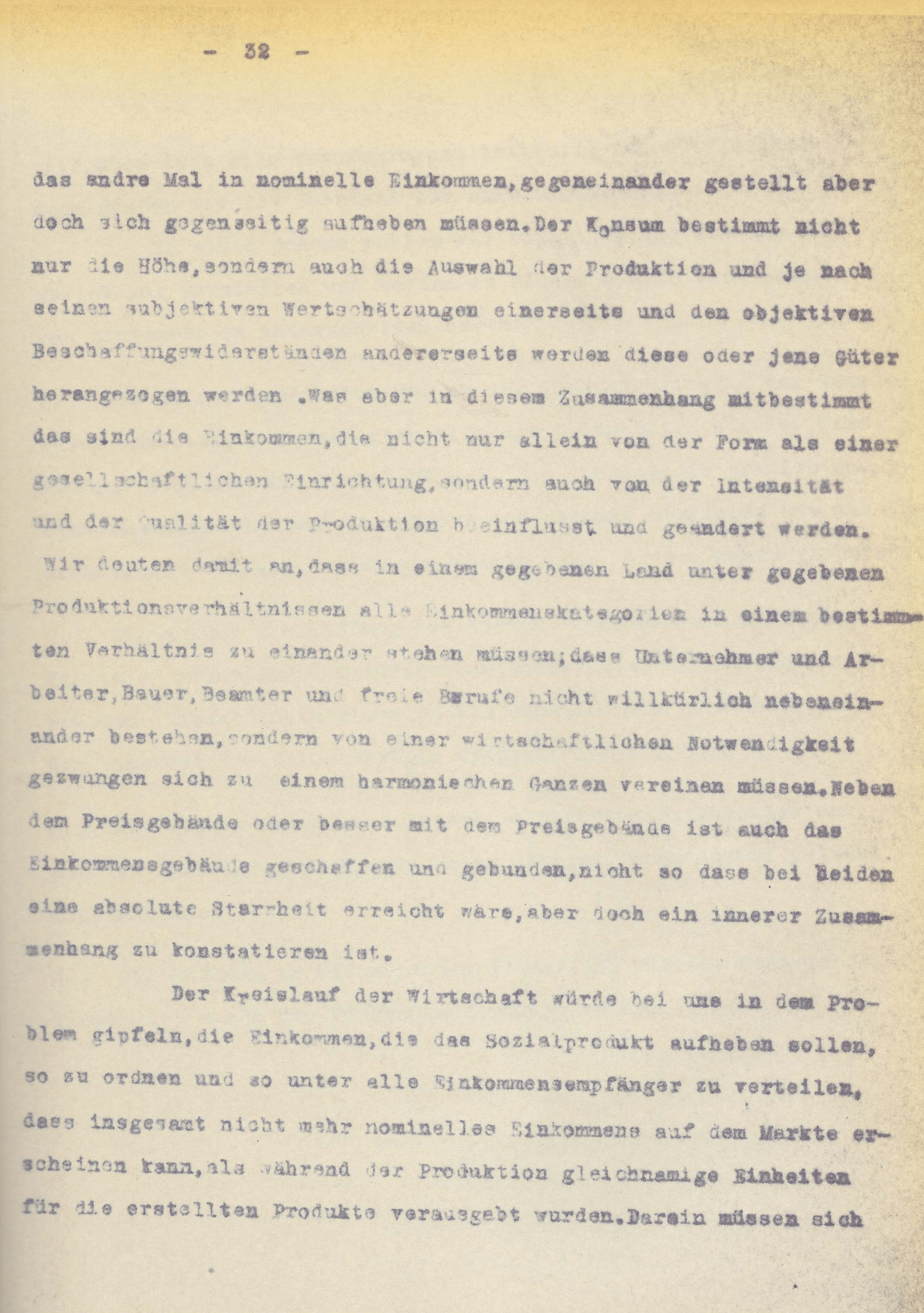 [S. 148]nung zu tun und die Valuta lässt nur das Chaos der Wirtschaft in besonders grellem Lichte erscheinen. Ebenso wenig dürfen wir glauben, fehlende Werte vom Ausland gestellt zu erhalten. Die ganze Wirkung muss sich im Lande selbst kundtun. In erster Linie umgewälzt wurde alles, was mit einer Forderung oder Schuld in irgendeiner Form zusammen hing. Was das Einkommen anlangt, so sagten wir davon bei der stabilen Währung, dass wir mit ihm gleichzeitig im Besitze des Equivalents hiezu sind und eine Auswahl gleicher Werte auf dem Markte uns zur Verfügung steht. Bei der gestörten Wirtschaft ist das Einkommen schon einmal in der Spanne, in der es dem einzelnen zur Verfügung gelangt, nur mehr oder weniger dasjenige einer Währung niedrigeren und verschiedensten Wertes; nämlich eines solchen, der auf dem Gütermarkte bereits in der Vergangenheit in Anwendung gebracht wurde. Dagegen könnte es möglicherweise auch ein Einkommen sein mit einer Wertmaass-Zugrundelegung, die auf dem Gütermarkte erst späterhin Regel wird; – auf der einen Seite also ein Einkommen, das nicht annähernd das Equivalent der Arbeitsleistung und – das ist wesentlich – auch nicht das des Einkommens am Tage der Leistung und auch nicht an dem des Bezuges darstellt, auf der anderen Seite wieder ein solches, das sofort ausgegeben, den Käufer in den Besitz grösserer Gütermengen setzt, als er an Werten der Wirtschaft beigesteuert hat oder bei Vorauszahlung nach leisten wird. Die meisten wirtschaftlichen Fragen waren nicht mehr solche der Ueberlegung und die einer Kalkulation, sondern Machfragen der Berufsorganisationen.