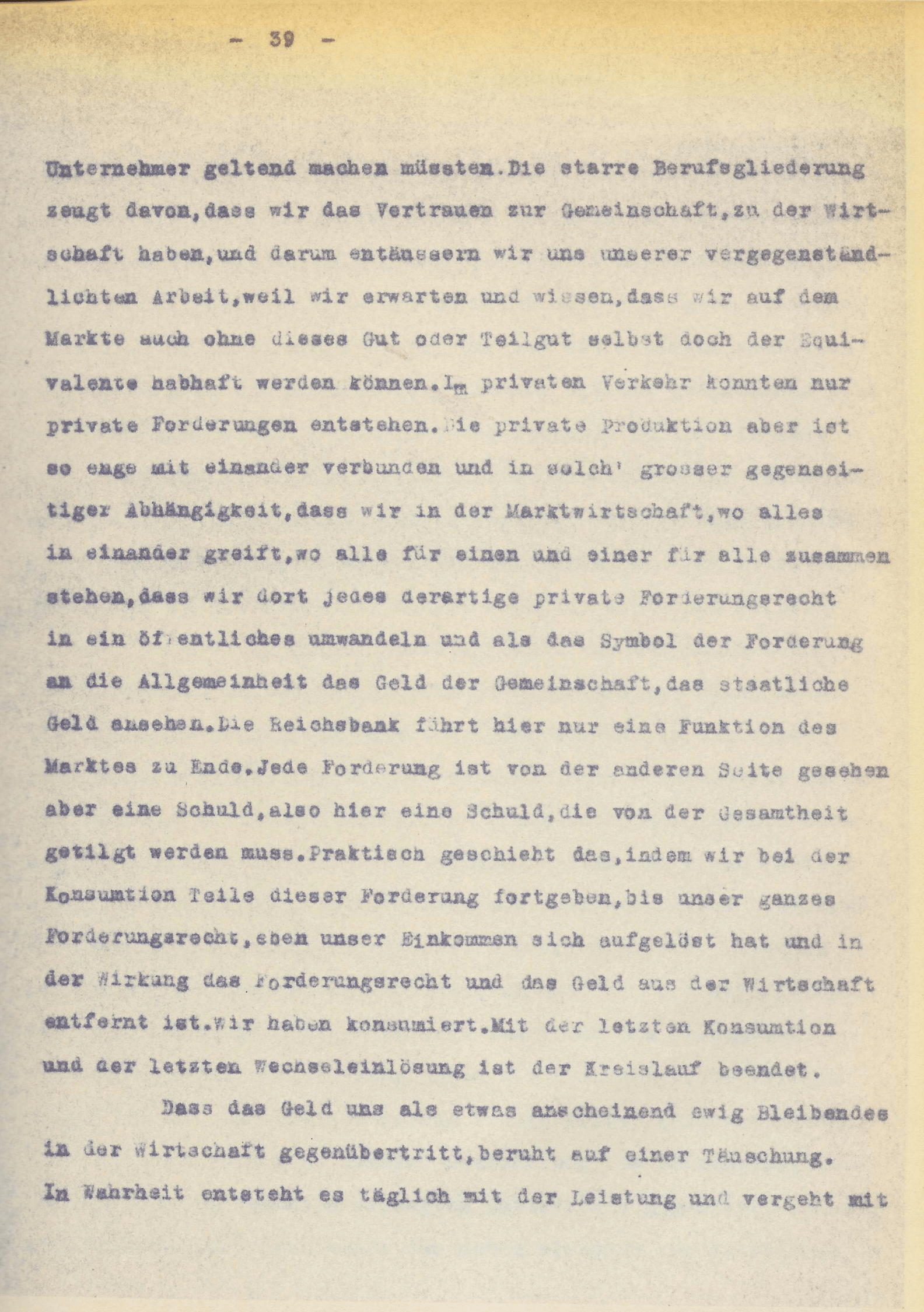 [S. 16] sondern als ein im höchsten Maass gesellschaftliches an, das in gesellschaftlichen, gesetzlichen Normen den sichtbaren Ausdruck finden muss. Und die Krönung der ganzen Entwicklung erleben wir in der Geldschöpfung auf Grund des acceptierten Warenwechsels. Die Tätigkeit der Instanz, die der Wirtschaft die Wechsel mit ihren zufälligen Summen ausgedrückt in Werteinheiten in staatlich begültigte Stücke auf runde Summen lautend, und dazu frei übertragbar, das ist in Geld umwechselt oder genauer gesagt, vorschiesst, ist, mag sie auch von einem, dem Namen nach privaten Institut wie der Reichsbank geleitet sein, eine durchaus volkswirtschaftliche, denn diese Stelle ist der organisierte Ausdruck der Gemeinschaft, sie handelt im Namen und zum Nutzen der Gesamtheit.
