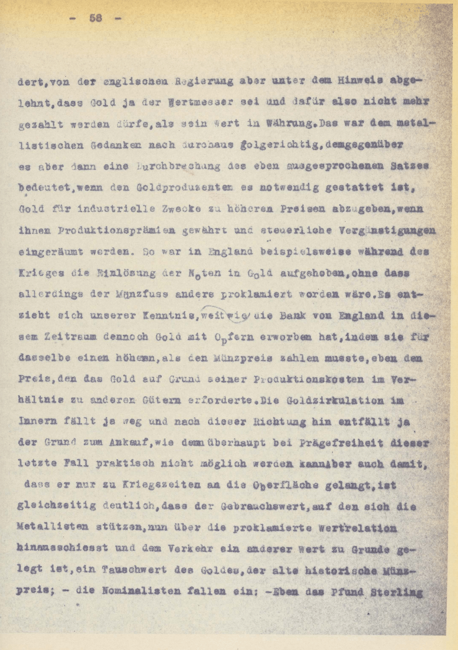 Wenn also eine Reduktion auf Gold als dem sogen. Wertmaass nicht auch gleichzeitig die Gewähr dafür bietet, dass auf lange Sicht hinaus keine Aenderung der Produktionsweise eintreten wird und infolge grösserer oder geringerer Wertschätzungen einzutreten braucht, so ist es unlogisch, auf diesem Punkte schon genüge zu finden. Nie und nimmer ist das Gold und ist kein Gut von Natur aus ein, über den Augenblick hinausreichendes absolutes Wertmaass und wenn es darum das Wesen der Werteinheit ausmachen müsste auf ein solches Gut von historisch gültiger Konstanz basiert zu sein, sie könnte dieser Funktion in der Wirtschaft nicht gerecht werden.